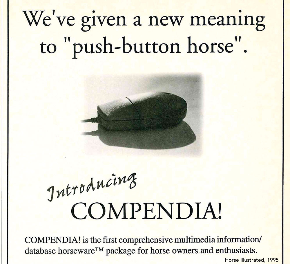 In between my deprived days and the current era of information overload, there were CD ROMs, like the COMPENDIA! Not only did COMPENDIA! provide a much more comprehensive resource on horse topics than my encyclopedias ever could, it included interactive features for keeping records, tracking bloodlines, and more. In fact, this ad from 1995 almost makes me yearn for the days when “the cloud” was a weather feature and computers actually had CD ROM drives. Those were the days.