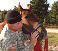 | This handsome red dun resides at the U.S. Army’s Smith Lake Stables adjacent to Fort Bragg, N.C., where he serves two very important roles. First, he’s a favorite mount in the riding academy, both as a trusty school horse and as a member of an equestrian summer camp. Second, he trains U.S. Army Special Forces soldiers for mounted duties. Although originally trained as a show horse, Panamas Sun suffered a traumatic injury that left his hindquarters scarred. He has a physical flaw, but his heart more than makes up for it. |