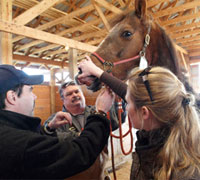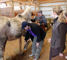 | Dr. Christina Cable and Dr. Michael Ball from the Early Winter Equine Medicine & Surgery in Ithaca, NY., with Richard Ryan of the ASPCA’s Volunteer Response team, conduct a dental and hoof exam on one of the 73 horses rescued on March 18th from an East Aurora, NY farm by the SPCA Serving Erie County. Photo courtesy ASPCA |
