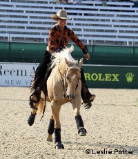 | Reigning WEG dressage gold medalist Anky van Grunsven made a surprise appearance with her reining horse just before the awards presentation in the dressage arena. Photo: Leslie Potter |
