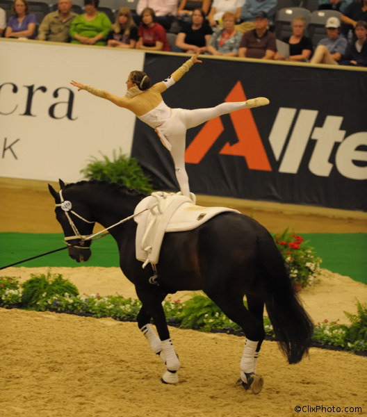 Antje Hill of Germany moved from eighth to third place with her freestyle, in which she showed a lot of stamina in her balance exercises, such as the hand stands, and remained in harmony with her horse throughout her performance.