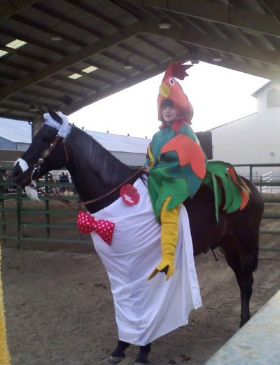 Amber dressed up as a chicken bravely riding the back of Colonel Sanders. Amber won a free, one-year subscription or renewal to Horse Illustrated.