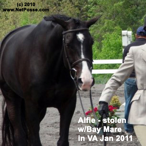 “I bred April myself and watched her first romp in the paddock. She is not even five and I have watched her grow into a fine young mare,” Ann told Debi Metcalfe, President of Stolen Horse International in a recent phone conversation. “Alfie, my 10 year old gelding, has been mine for six years now. He has a home for life with me and we were planning to compete again in just a few weeks.”
