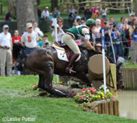 | Jumps that break or fall on impact help reduce the risk of rotational falls. Both horse and rider were unhurt and able to finish the rest of the course after breaking through this log at the 2010 Rolex Kentucky Three-Day Event. Photo: Leslie Potter |
