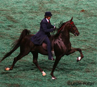 | Debbie Foley rides Callaway’s Annabel Allison in a five-gaited class at the 2009 American Saddlebred World’s Championship Horse Show. Photo: Leslie Potter |