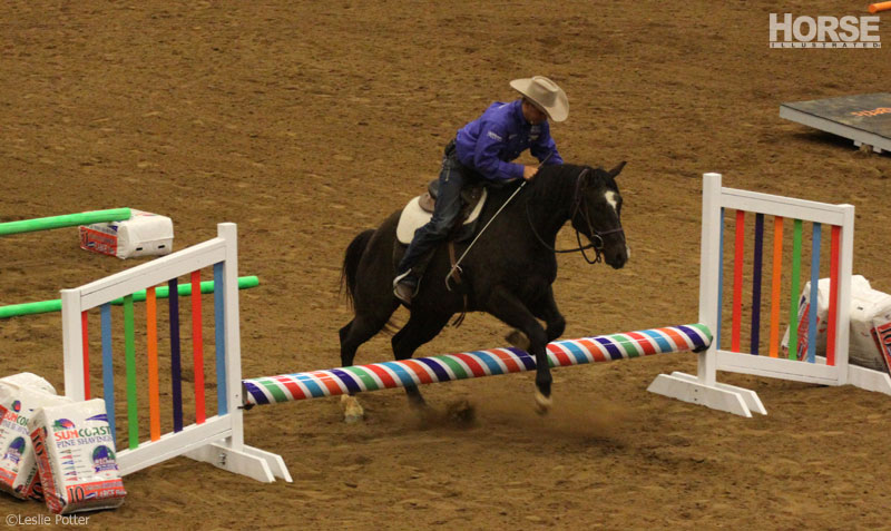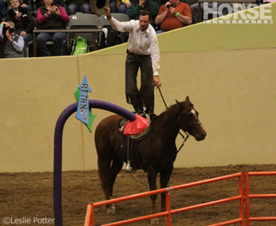 After finishing the obstacle course, Field used the few minutes he had remaining to perform a freestyle maneuver in classic Road to the Horse fashion. He stood up on his colt’s back, and Mojo stood still for him, allowing the duo to finish on a high note.