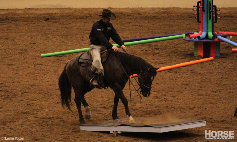 The teeter-totter can be an intimidating obstacle for a green horse, but Anderson was able to convince Smoky to cross it several times in both directions.
