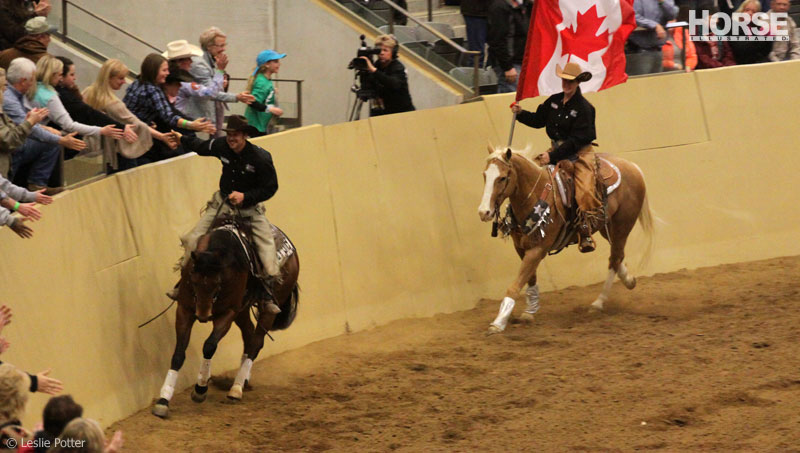 The winner of last year’s wild card competition, Jim Anderson, was the second Canadian in the order of go. His horse, Smoky, is a distinctive grulla with racing bloodlines. Once mounted, Anderson allowed the colt to take several laps around the arena at a fast canter. He explained that Smoky was inclined to move forward, and he wanted to give him the chance to do that before getting down to business.