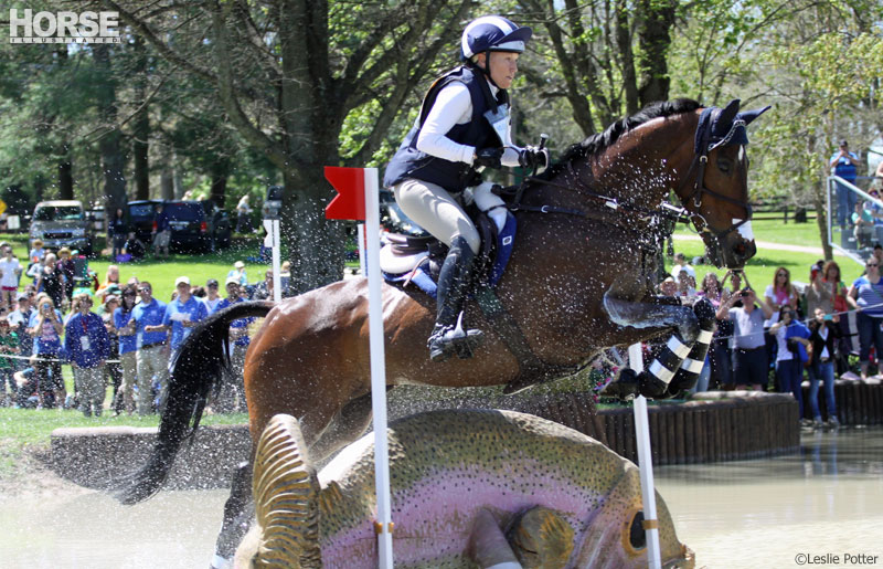 Nasal strips are a common sight in the cross-country phase of three-day evenitng. Here, Hawley Bennett-Awad rides Gin and Juice at the 2014 Rolex Kentucky Three-Day Event. Photo: Leslie Potter