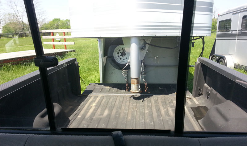 2. Next, line up your tow vehicle with the front of the trailer. If your trailer has an embellished paint job (some have a “V” in the front of them), it will be easier to make sure you’re straight. Some truck liners have round impressions in the pour-in liners that denote the middle of the bed. Additionally, you can spray a small circle in the center of your truck bed to help you line up properly, or lay down a broom or farriers rasp to help guide you. For SUV’s, a small sticker or marker on the center bottom of your rear window will help align you more quickly. Also, a step-in fence post or a tall stick can be stuck in the ground just behind the hitch on the trailer to make sure you’re square.