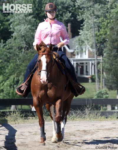 You’ll feel the least amount of impulsion and rhythm when your horse is at the walk. Ask him to go straight by riding two-handed with a light and even feel of the bit. If your horse wanders, softly close your fingers on both reins to create “walls” on either side of his body while encouraging him to step lively with pressure from your legs or nudges from your heels that match the tempo you are trying to create. It may take several strides for your horse to figure out what you’re asking him to do. Be patient and consistent with your rein contact, giving your horse as much time as he needs to figure out how get his body in the correctly aligned position. Then immediately release your cues when his stride strengthens and he confidently steps straight through the middle of your rein contact.