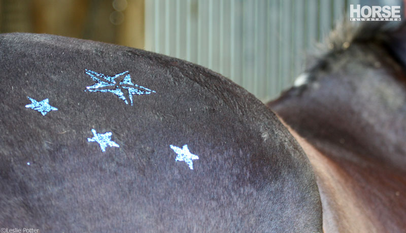 For parades and educational showcases, or even those days when your horse just needs a red heart painted on his rump, body paint is an easy and fun way to add color and design to your horse’s coat. Before applying, always make sure the paint is water-soluble, which means it will easily come off with water. Don’t use latex or oil-based paints, as these can be very difficult to remove, irritating to the skin, and toxic.