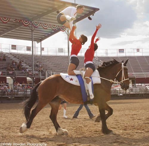 Today the team enjoys a busy schedule, jumping into the season with weekly Renaissance festival performances throughout May, followed by summertime rodeos entertainment acts. While the Renaissance fair shows feature elegant costumes and talks about the history and roots of vaulting, the rodeo crowd enjoys high-energy choreography and live music, with a grand finale of tossing the group’s country singer, Jentry Cole, over horse’s croup.