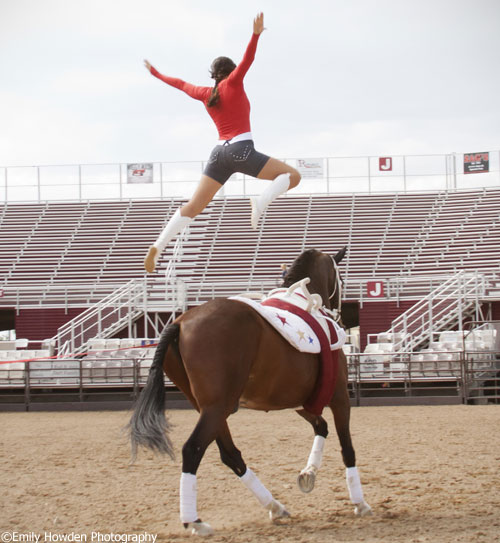 Vaulting itself is what keeps James’ fire burning. “I love building a new team every year, seeing how well the girls and horses work together,” remarks James. “It’s tough to keep training in the winter with Utah weather and vaulters in school, but being together with the girls and horses, seeing amazement of crowd is so rewarding for all involved. We want people to know about what the sport is- and the more visibility we get is really cool.”