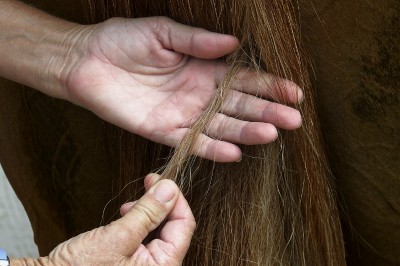1. Separate a section of hair from deep within your horse’s tail. The section of hair needs to be about 12” long, but you don’t need a whole bunch. Lay the strands flat against the palm of your hand. It should measure about ½” inch wide. Snip the hair off with scissors and place it inside a plastic baggie.
