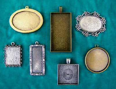 8. You’ll also need a metal pendant with a frame around its edges. The shape doesn’t matter, but it has to be the right size to hold your charm. Once you have a match, apply a small amount of Vintaj metal patina onto both the charm and pendant. Use it just like paint. When it dries, remove as much excess patina as you like by rubbing the metal with a rough terry cloth rag.