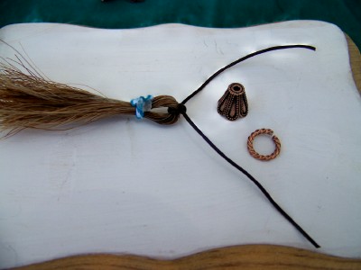 4. (Now we’ll pretend I’ve been using leather cord all along instead of striped twine). Just let the excess leather cord hang down from the knot; we’ll add some beads in a moment. But next, cut through the bottom loop of the horse hair oval. Lift it all away from the nails. Trim the hair straight across the bottom of your newly created tassel so it’s all the same length. Take the other 8” piece of leather cord and slide it through the loop at the top of the tassel. Tie a simple knot. Pull the excess ends through the hole of your end cap. Squeeze the tassel so you can push it even deeper into the end cap.