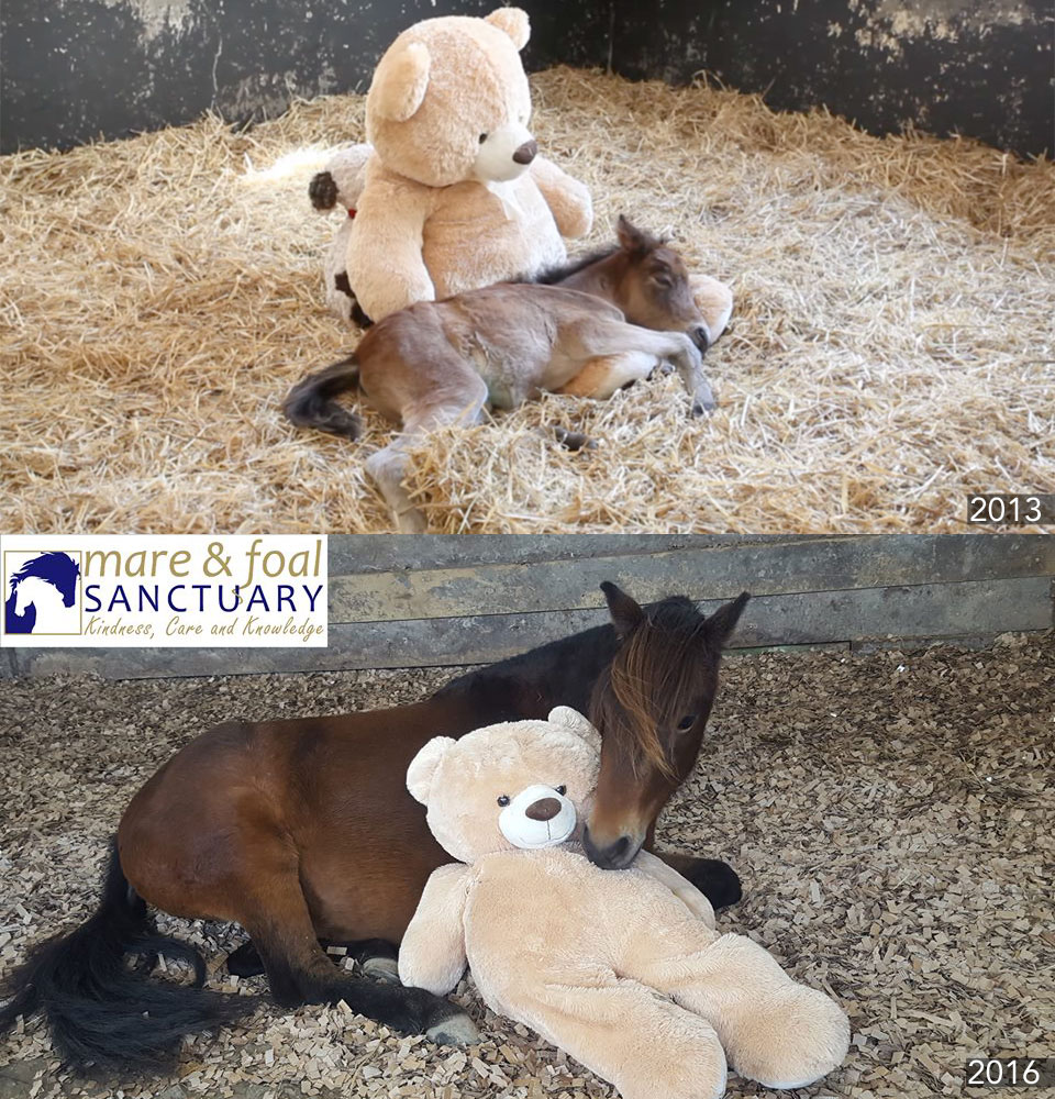Remember the simultaneously heartbreaking and heartwarming story of Breeze the orphan foal? After being rescued by the Mare and Foal Sanctuary in England, Breeze was given an oversized teddy bear (named buttons) to keep him company and comfort him in his stall. Watch a video of baby Breeze snuggling with Buttons here.