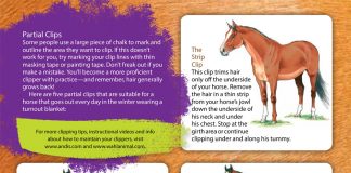 2. Unless you’re preparing to compete in a halter or showmanship class, you needn’t shave each stocking entirely. You only need to clip away the permanently discolored hair. Most of this will be located on the front of the fetlock and along the back of the pastern.