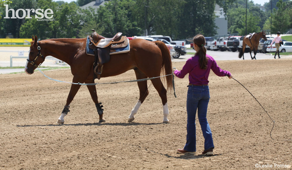 One purpose for longeing a horse is to get him physically and mentally ready for more serious work—it can be a great way to burn off some excess energy. This means that you should always be on the lookout for the occasional buck, kick, or other rambunctious behavior. Be especially on guard if you’re longeing out in the open at a show—the combination of a show environment and a change of scenery may make your horse more excitable about being longed.