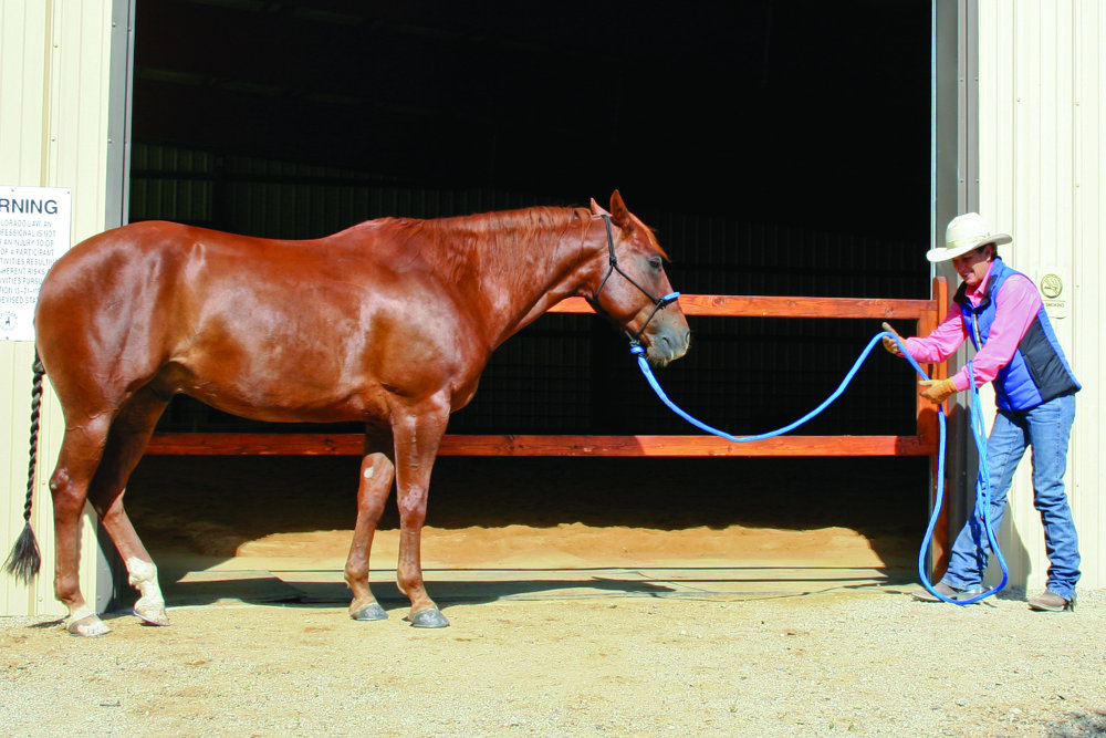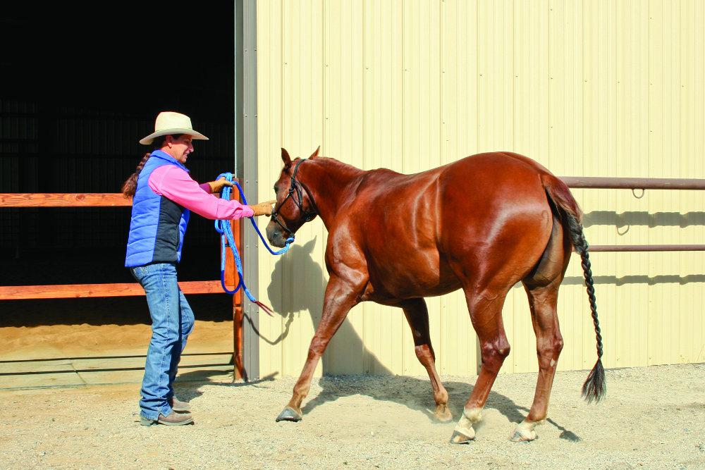 Work in a large barn aisle, indoor arena or a paddock that has good footing, and make sure your horse has enough room to move without hitting a wall or rail. Your horse will learn not to trust you if you ask him to move directly toward a wall or rail. A horse doesn’t know if you’re only asking him to move a little bit—if there’s a solid wall in the direction you want him to move, he will think he may hit it. Outfit your horse in a rope halter with a 12- to 15-foot training lead attached with a rope-to-rope connection. Wear gloves to protect your hands.