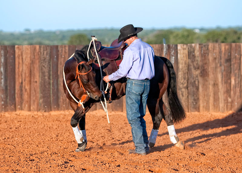 Anytime the horse leans into the circle, tap his belly with the training stick to get him to bend his ribcage. When he leans into the circle, it’s because his body is stiff and he’s lost the bend through his ribcage. Using the stick in this manner is very similar to what your leg will do while riding. Don’t turn into a nag, though. Use a tap, tap, whack rhythm to bend his ribcage.
