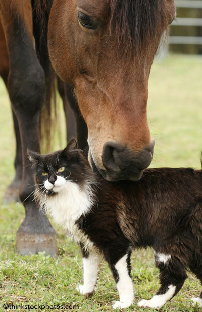 Most behavioral scientists agree that the reason such amicable alliances form between horses and other animals is due in large part to the horse’s unique social nature. According to Stephen Budiansky, author of The Nature of Horses, horses show a strong fundamental instinct to form long-lasting attachments to specific individuals. This basic instinct toward bonding is the glue that holds harems, the fundamental social structure of the horse, together. But so general is this drive to bond that it appears within horse society in many contexts that have nothing to do with mating. Horses removed from a herd will also readily form attachments to human owners or even a barn cat.