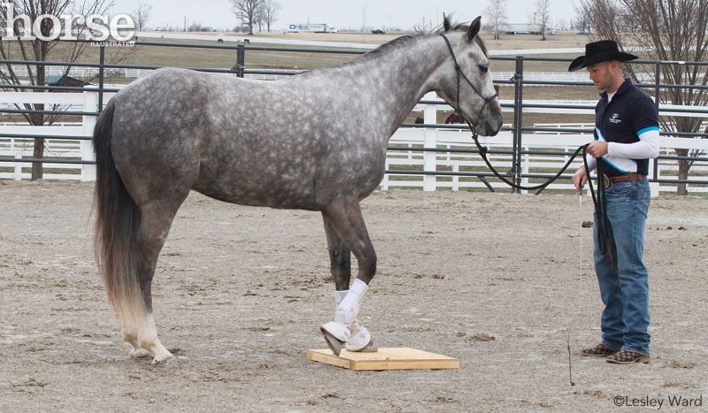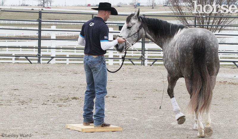 “Mark training” teaches a horse to enjoy going to a designated spot. Dan James starts with a block of wood before moving to the trailer. When his horse reaches the wood block, James releases pressure and allows him to relax.