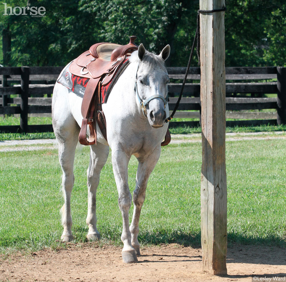 Instead hold the lead in your hand while you groom and saddle your horse. Give her plenty of slack and allow her to move her feet anytime she gets nervous before gently guiding her back to her original position. Ask her to stay still only as long as she’s able and praise any effort.