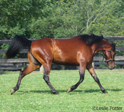 When considering a longeline prospect, observe the young horse as he moves freely across the pen or arena. Do his gaits remain steady with a natural cadence, or does he tend to pick up speed or want to play excessively? While traveling at each gait, does he lift his knees and hocks up toward his body, or does he reach through from his hips and shoulders with a long, low and fluid stride?  Does he have natural eye appeal, or is his personality lackluster and his expression plain?