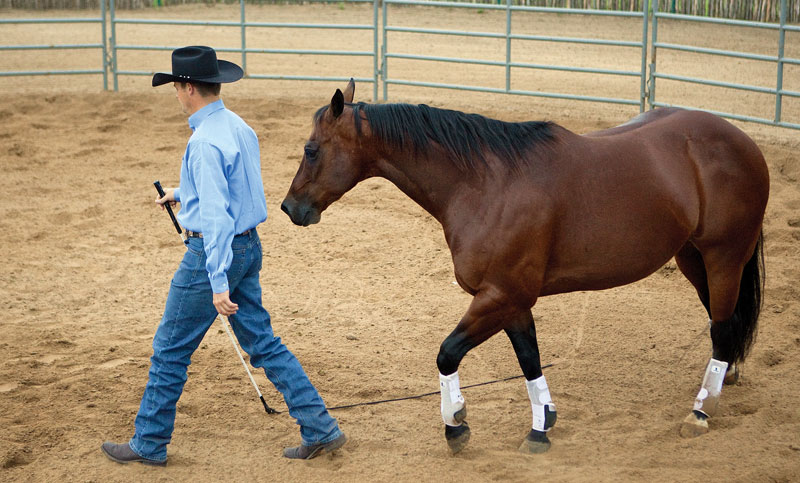 Regardless of age or background, I begin all horses’ training in the round pen. As far as I’m concerned, the round pen is the safest area for you and your horse to initially build a relationship because you’re not connected to each other. Anytime you’re connected to a horse by a lead rope, you have to be relatively close to him. If he tried to do something disrespectful like kicking, biting or running over you, the chances of you getting hurt would be much higher. When you’re working with an unhandled older horse, this is an especially important safety factor to consider.