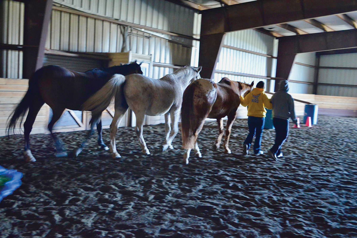 In an exercise called “billiards,” a horse enters the arena from his stall, moving freely. The student in the center goes to connect with the horse, approaching slowly, with a gentle voice, as they would need to do for a human patient.