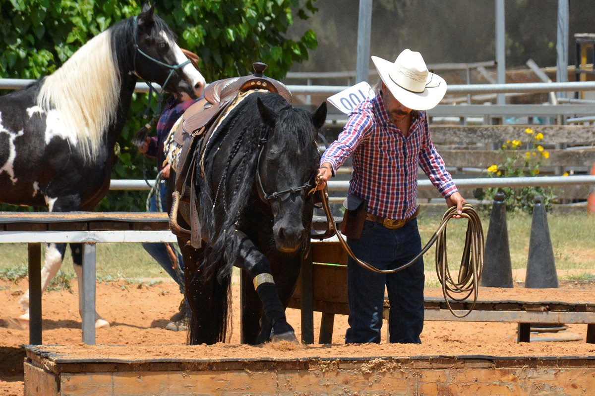 Mark always starts people on the ground first, to get the horses and riders used to the obstacles in-hand, before mounting up. The 35 participants learned the Bolender Method, which involves teaching your horse to stay out of your “bubble” so they don’t come over on top of you while completing an obstacle.