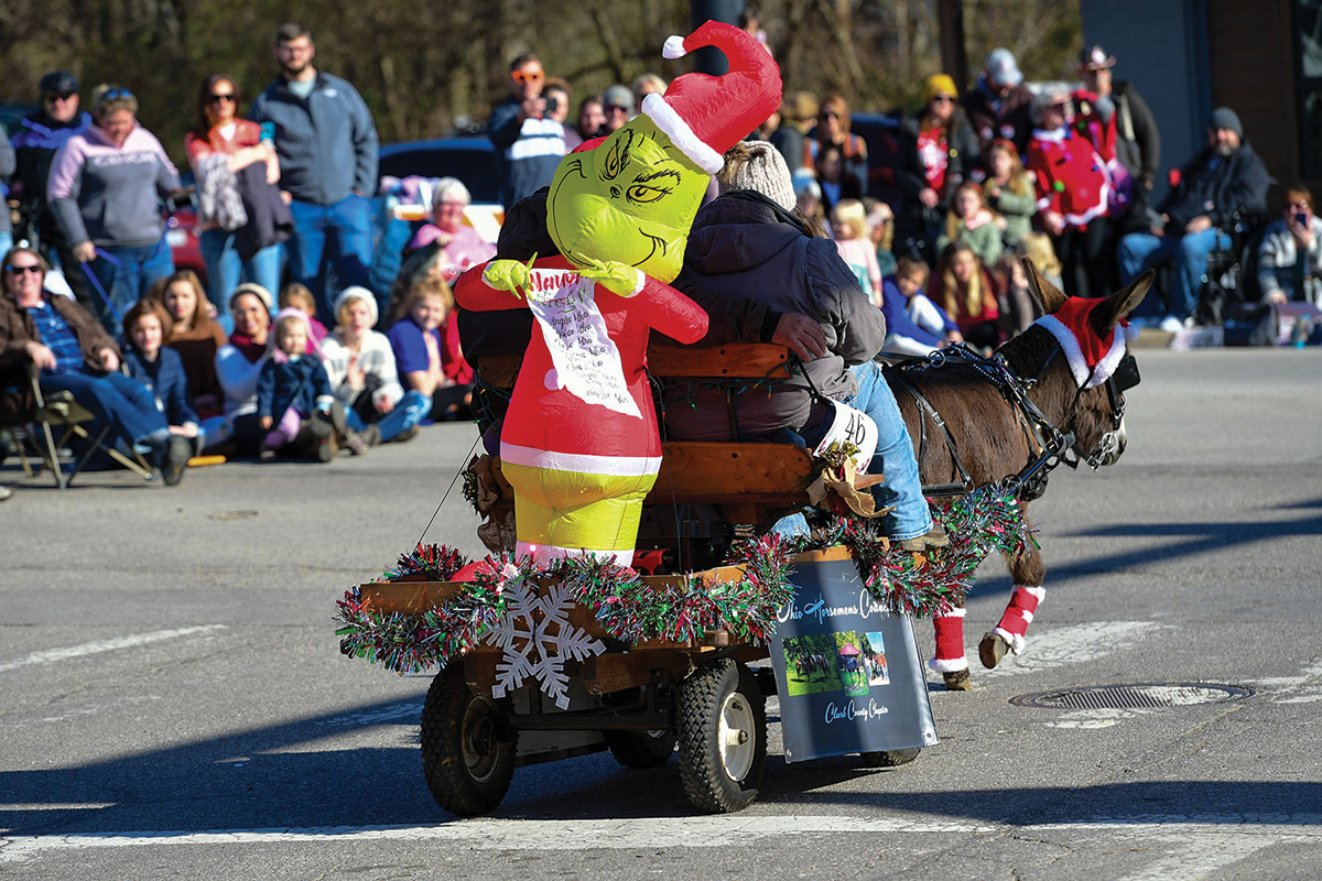 - Dr. Seuss’ Grinch rides on the back of a cart pulled by miniature donkey Festus, driven by his owner Kristina Valentine. They represented the Clark County Chapter of the Ohio Horseman’s Council. Photo by MacMillan Photography