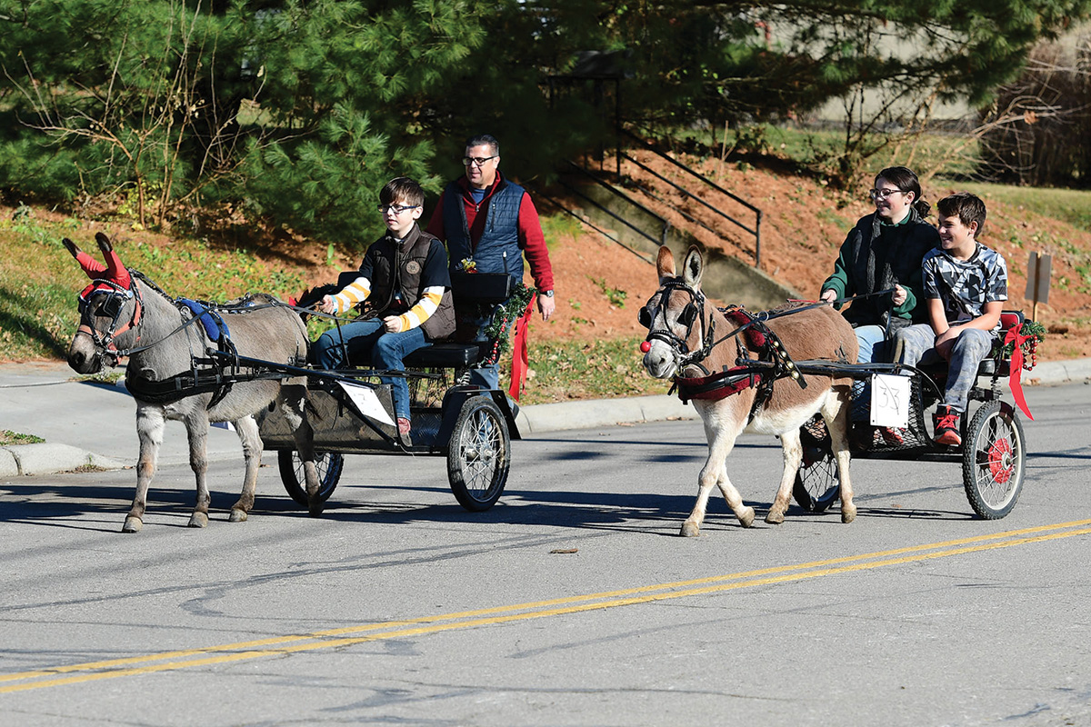 - This adorable mini donkey sports a “Rudolph-esque” red nose and is driven by Cathy Stewart of Stewart Family Farm. Photo by MacMillan Photography