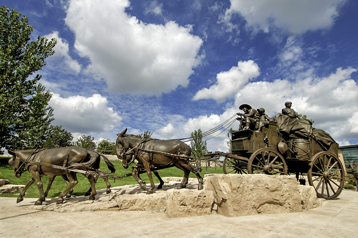 - Downtown Omaha features a number of impressive life-sized bronze sculptures featuring scenes from the region’s past. This mule wagon bronze is a feature in Pioneer Courage Park. Other bronzes feature a flock flying geese and American Bison. Photo courtesy Visit Omaha