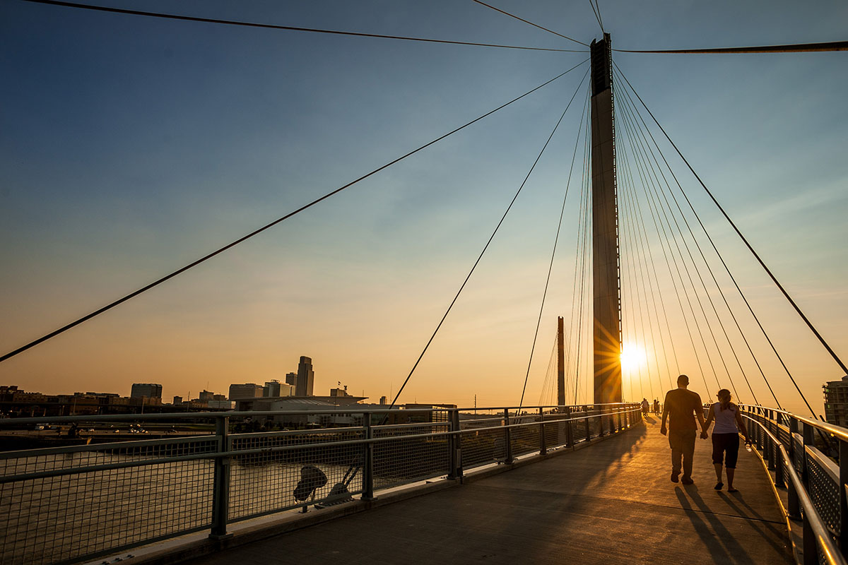 - The entrance to the 3,000-foot Bob Kerrey Pedestrian Bridge, affectionately known as “Bob the Bridge,” is just steps away from the CHI Health Center where the World Cup Finals will take place. The bridge spans the Missouri River between Omaha and Council Bluffs, Iowa, and the line between the states is marked on the bridge. Photo courtesy Visit Omaha