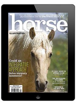 The April 2021 Digital Issue of Horse Illustrated includes using an integrative approach to solve mystery lameness, easy steps to spring cleaning your tack room, purchasing cowboy boots, perfect reining circles and jumping distances, the Curly Horse breed, and more (see the full contents above).