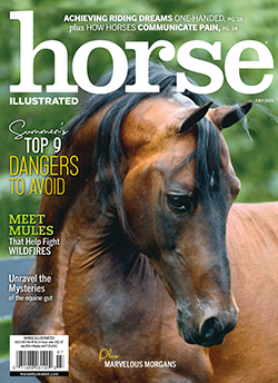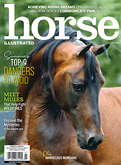 The July 2021 Print Issue of Horse Illustrated includes helping summer's top 9 dangers to avoid, horses and mules that fight wildfires, how horses communicate pain, the equine gut, achieve riding dreams one-handed, Morgan Horses from Vermont, mastering the showmanship pivot, and more (see the full contents above).