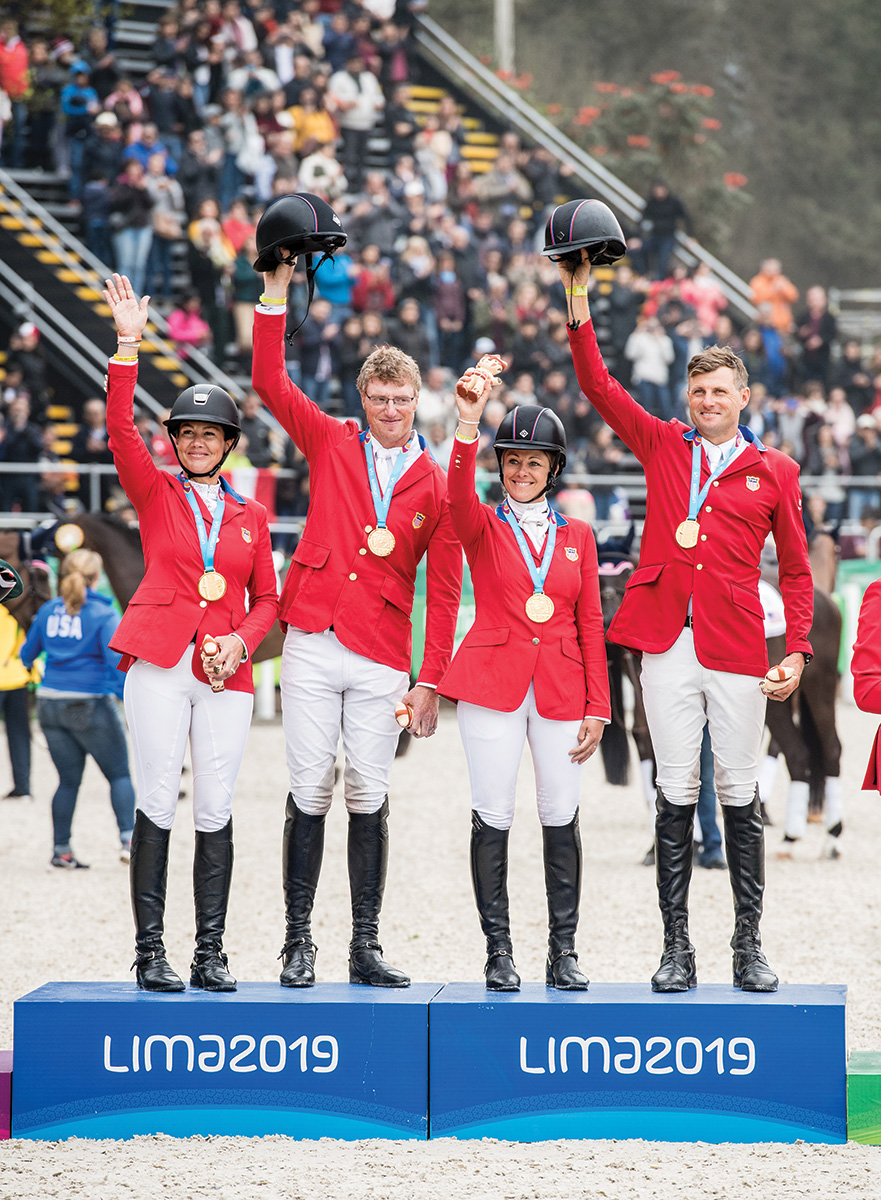 Left to right: Tamie Smith, Doug Payne, Lynn Symanski, and Boyd Martin won team gold at the 2019 Pan American Games in Lima, Peru. Photo by Shannon Brinkman