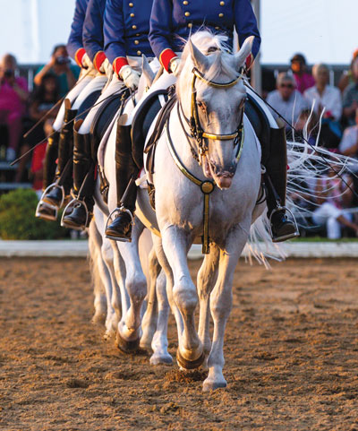 The quadrille is often referred to as the “Ballet of the White Stallions.” It is the grand finale to each performance with intricate choreography, precision and elegance. Photo by John Borys