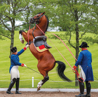 The levade is a former battle maneuver that is considered a “high school” movement, or haute école in classical dressage. Head trainer Bill Clements demonstrates a mounted levade on Maestoso Amarika. Photo by John Borys