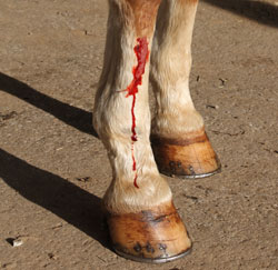 | A little fake blood and scar skin, and Chance only looks like he’s cut his leg. No horses were harmed in the making of this photo. Photo: Lesley Ward |