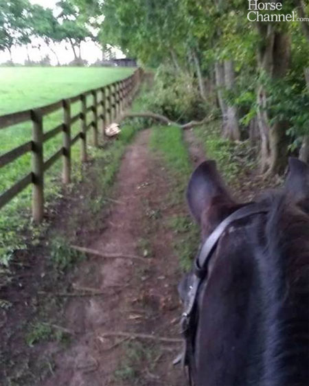 There’s another water crossing on this journey around the farm that tends to be more of a challenge. When there’s been a lot of rain, we get a mini-river in between two paddocks. I used to have to persuade Snoopy to go near the moving water, much less through it, but he’s gotten better. Sometimes he jumps it, though, and I had this in mind as we approached; I don’t jump bareback very often. Fortunately, after giving it some thought, he decided he’d just trot through instead of trying to clear it.