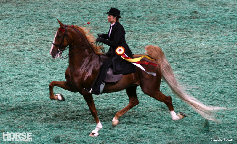 Here’s Melinda Moore on her home turf, piloting Attache’s Royal Crown to a Reserve World Championship in the open five-gaited division in 2009.