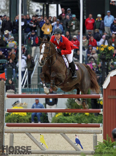 | McLain Ward looked pretty comfortable aboard A Long Good Night Kiss (left). But he probably perfers flying over grand prix jumps with Sapphire (now retired, but shown in the right photo at the 2010 Alltech FEI World Equestrian Games.) | |