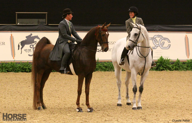 “Can’t we all just be friends?” Hunter trainer Jennifer Alfano (left) on The Blue’s Girl and Saddlebred trainer Stephanie Sedlacko on Special Edition chat just before being announced winners of the first Multi-Breed Challenge at the 2013 Alltech National Horse Show.