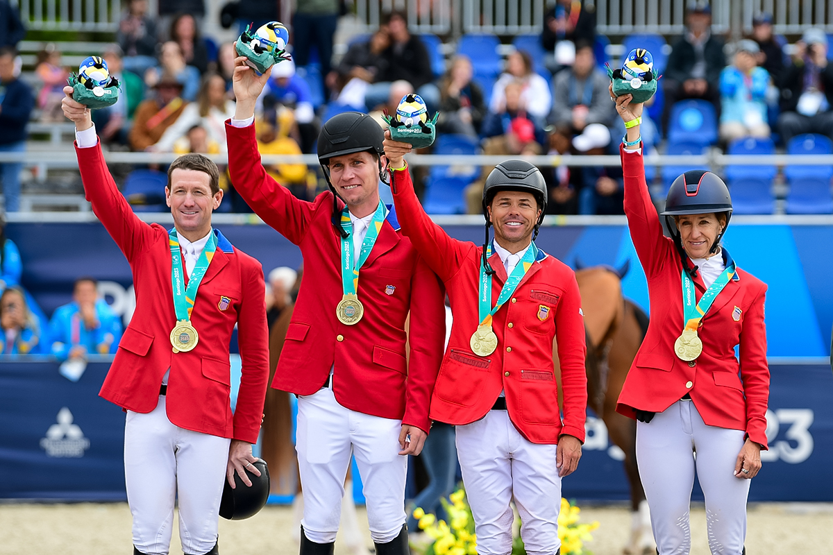 - With seven fault-free out of eight total rides today, the U.S. Team well earned their Pan American Games gold. This earned the USA a spot to try for more gold at the Paris Olympics next year. Left to right on podium: McLain Ward; Karl Cook; Kent Farrington; Laura Kraut. Photo by Allen MacMillan/MacMillan Photography
