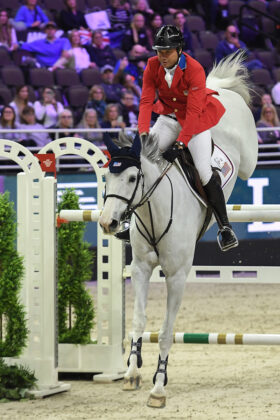 Hunter Holloway and Hayes Investment Corp.’s Pepita Con Spita led the US contingent of jumper competitors on the second day of competition. Pepita is a 12-year-old Westfalen mare. After a clear first round and dropping one rail in the jump-off, they placed 7th on the second day of Longines World Cup Finals jumper competition in Omaha on April 6. Photo by Allen MacMillan/MacMillan Photography