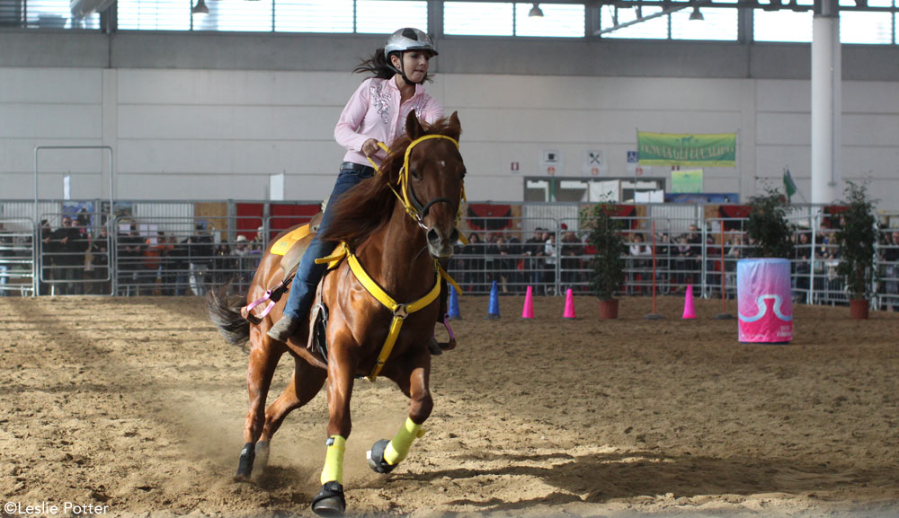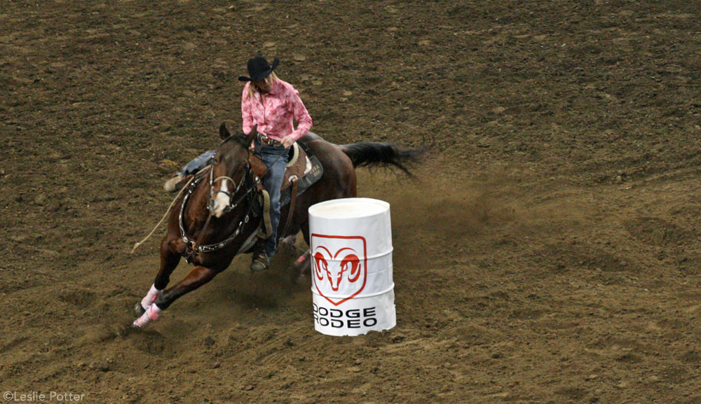 When you’re running barrels, look at the pocket—the area just in front of and around the barrel where you slow down to make your turn. Horses go where their riders are looking, so if you focus directly on the barrel, you’re more likely to run into it. Once you round one barrel, look up at the next barrel’s pocket.